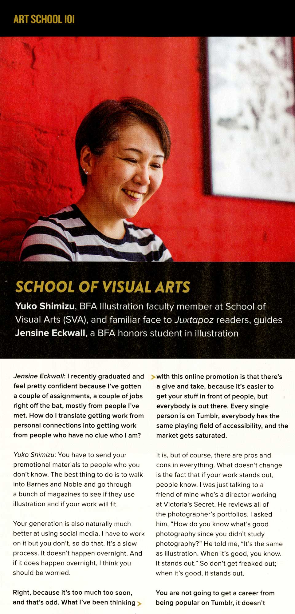 I had an honor to represent School of Visual Arts where I have been teaching illustration classes since 2003. One of my former students and very talented young artist Jensine Eckwall and I had a conversation which is featured in this article.