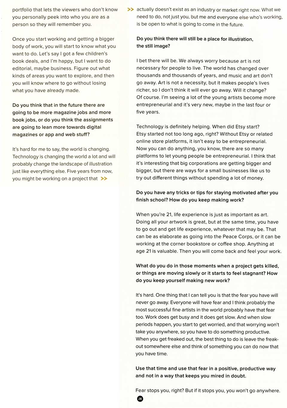 The latest issue of JUXTAPOZ Magazine(September 2013) has a big feature called Art School 101, where recent graduates from four different US art schools ask questions to their professors about life after art school.
