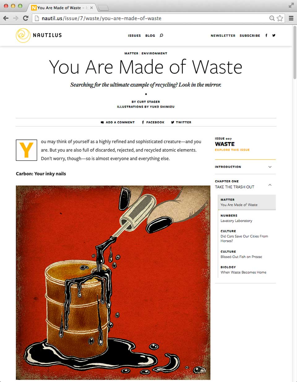 There will be total of 12 illustrations I created accompanying various interesting and informative articles in theme of WASTE coming out every Thursday for next three weeks. The first chapter just launched today. So, please take a look at this beautifully designed site, and read the smart articles.