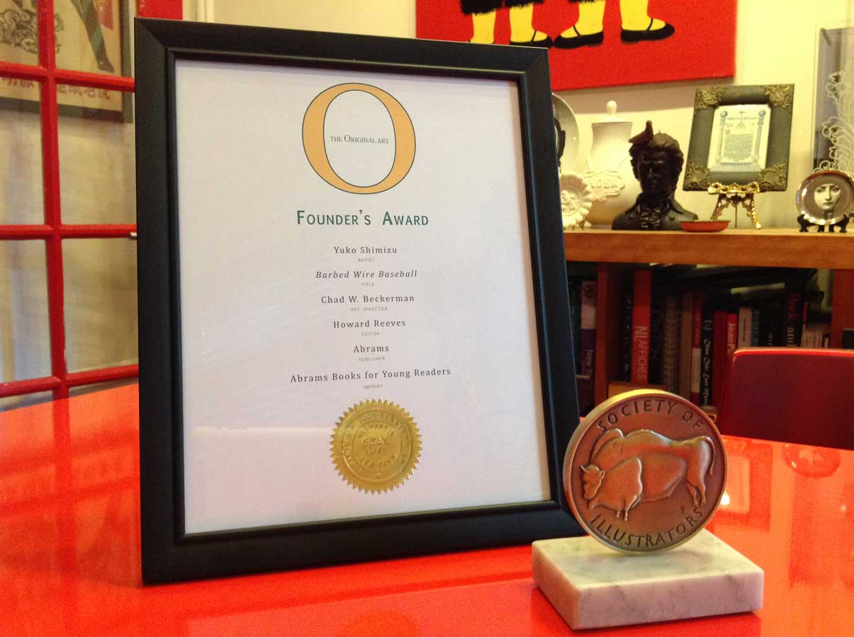 The Original Art exhibit opened last week at the Society of Illustrators. This is an annual competition for children’s book that was published this year. The book I illustrated Barbed Wire Baseball was honored to receive Founder’s Award, which is given each year to an illustrator who is new to children’s book.