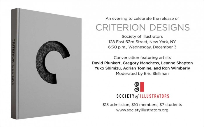 The Criterion Collection, a continuing series of important classic and contemporary films, has commissioned work from some of the most exciting illustrators and designers working today. Artists David Plunkert, Gregory Manchess, Leanne Shapton, Yuko Shimizu, Adrian Tomineand Ron Wimberly, along with moderator Eric Skillman, will discuss the process of creating new art for great cinema, and celebrate the release of Criterion Designs, a new book featuring features covers, supplemental art and never-before-seen sketches and concept art. Followed by a book signing and reception.