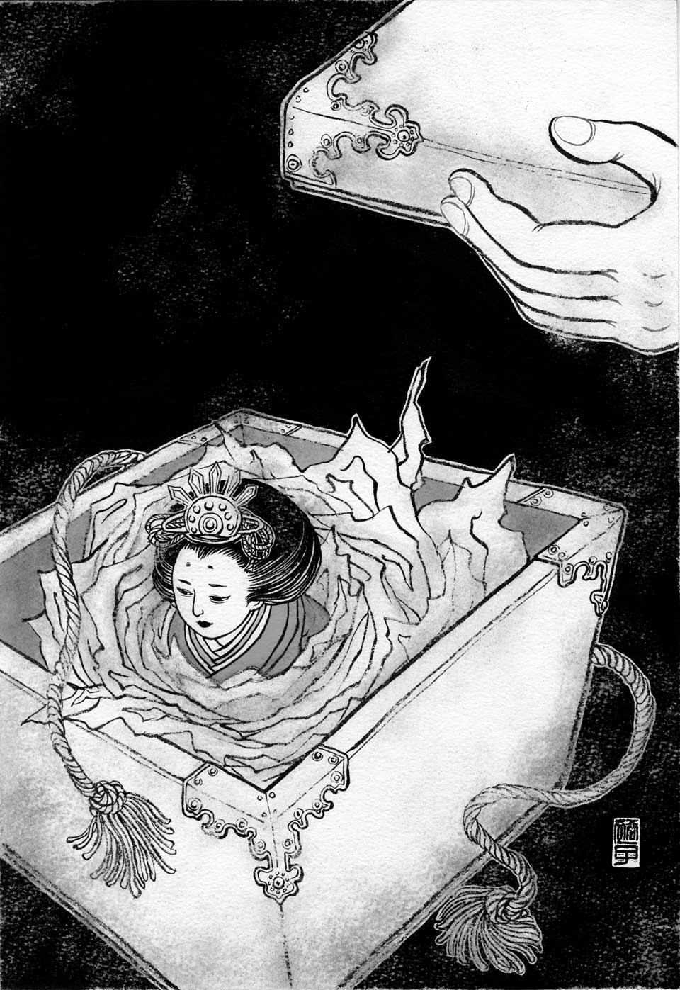 One of the interior illustrations for the reissue of The Beautiful and the Grotesque, a collection of short stories by Japanese writer Ryunosuke Akutagawa. Published in 2010.